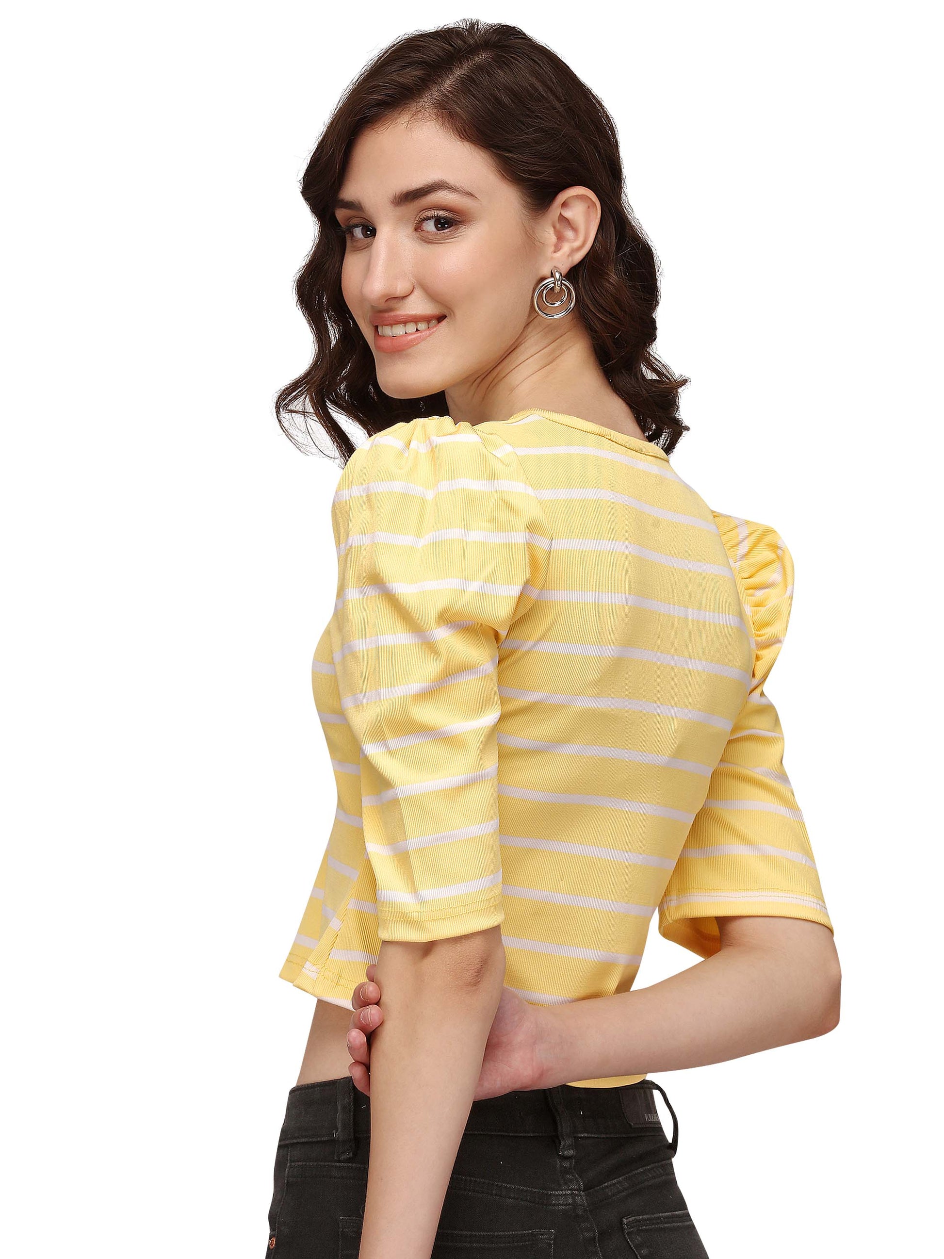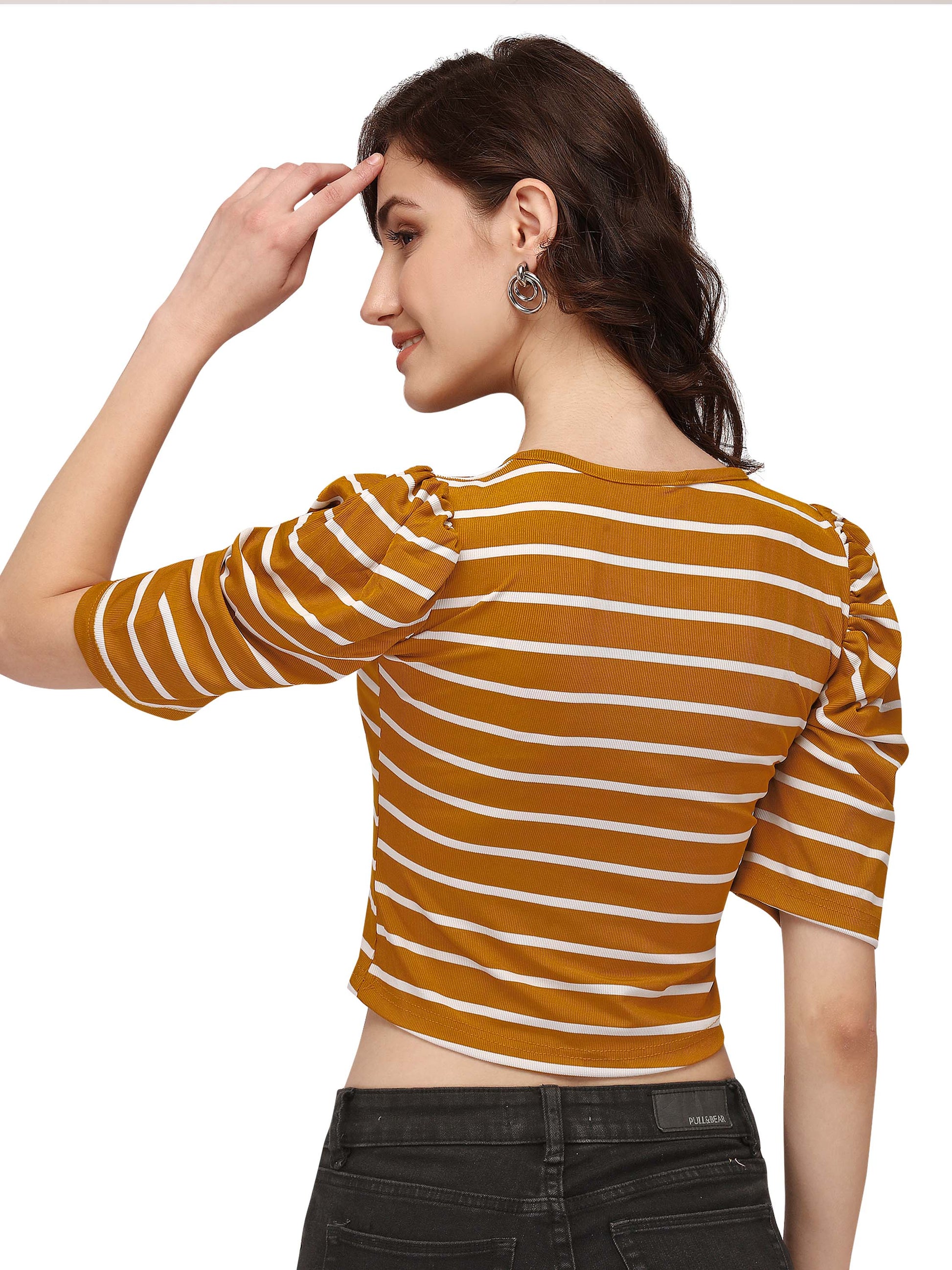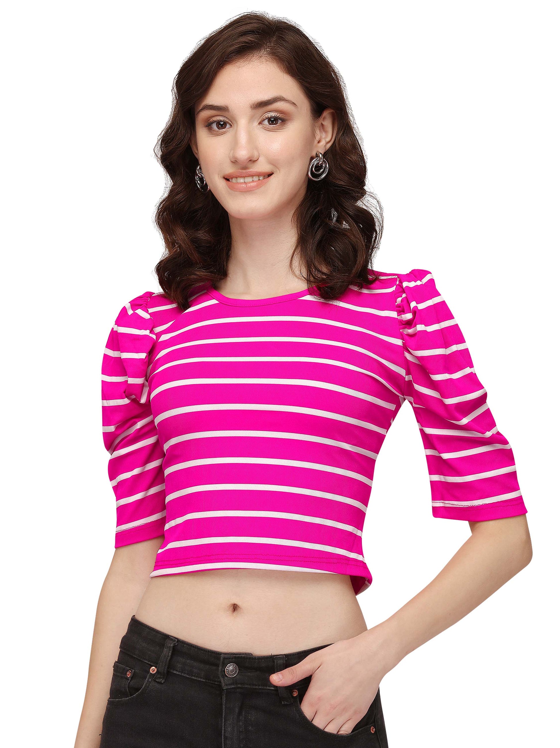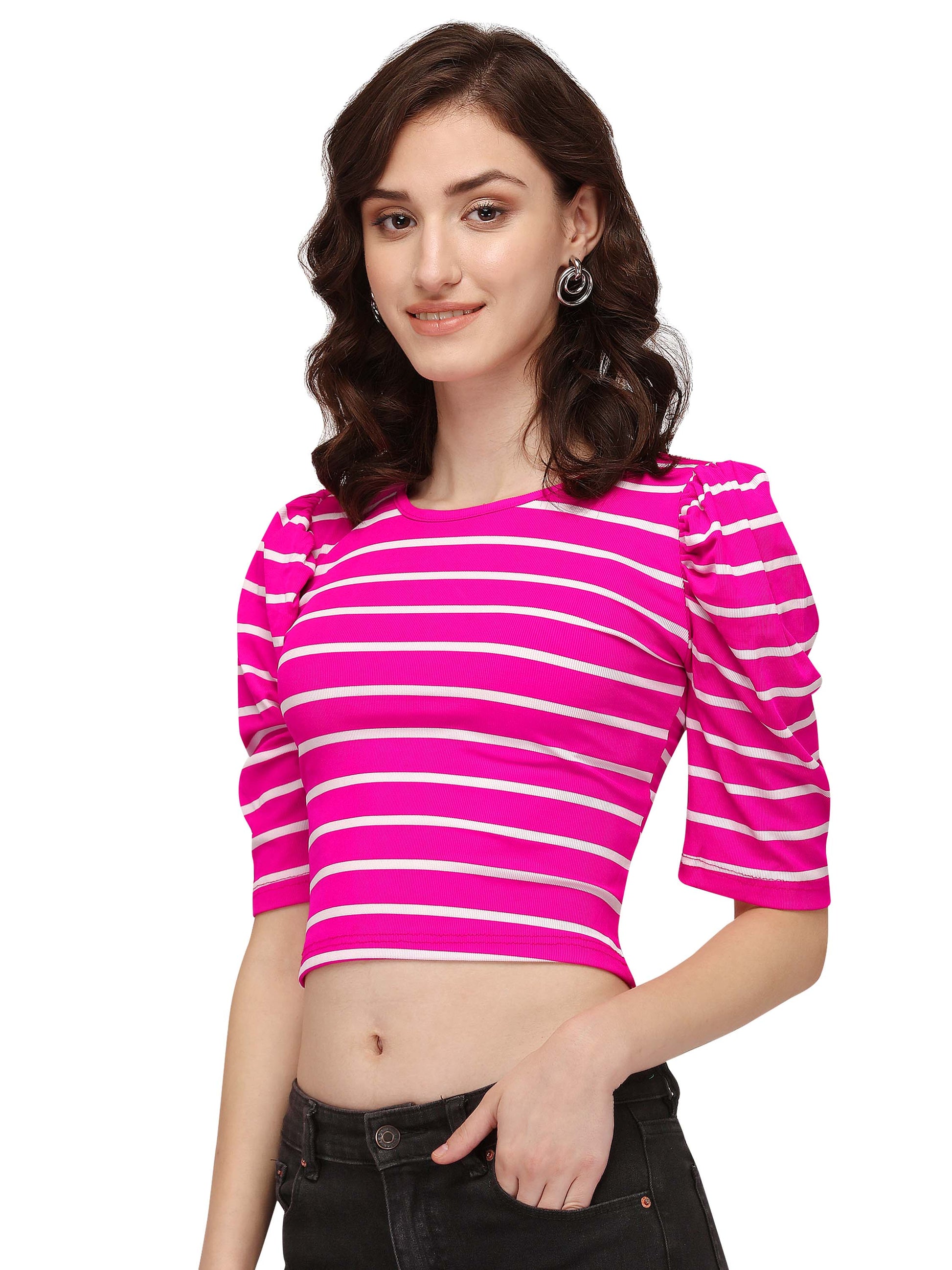 Look effortlessly chic in our NiloBerry Puff Sleeve Stripped Elite Top. The soft and breathable fabric, with a hint of texture, sets it apart from the rest. With its 4 way stretch, this round neck striped top pairs perfectly with jeans, trousers, skirts, and even sarees. Upgrade your wardrobe with this versatile and stylish top for women.