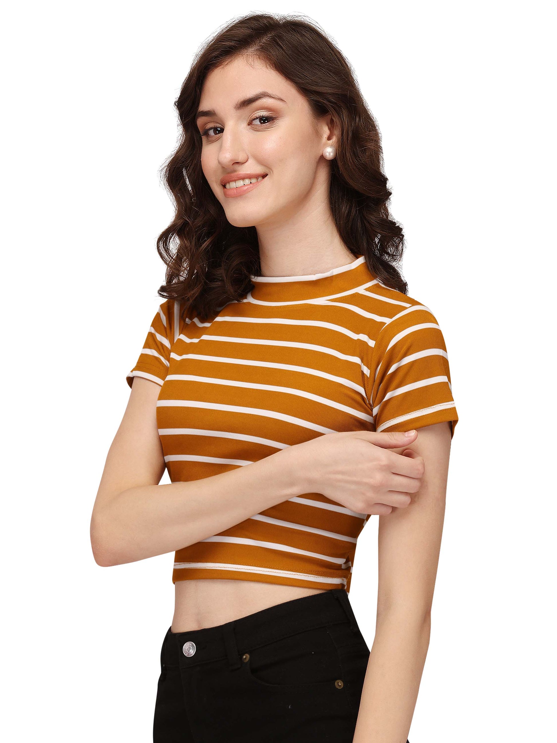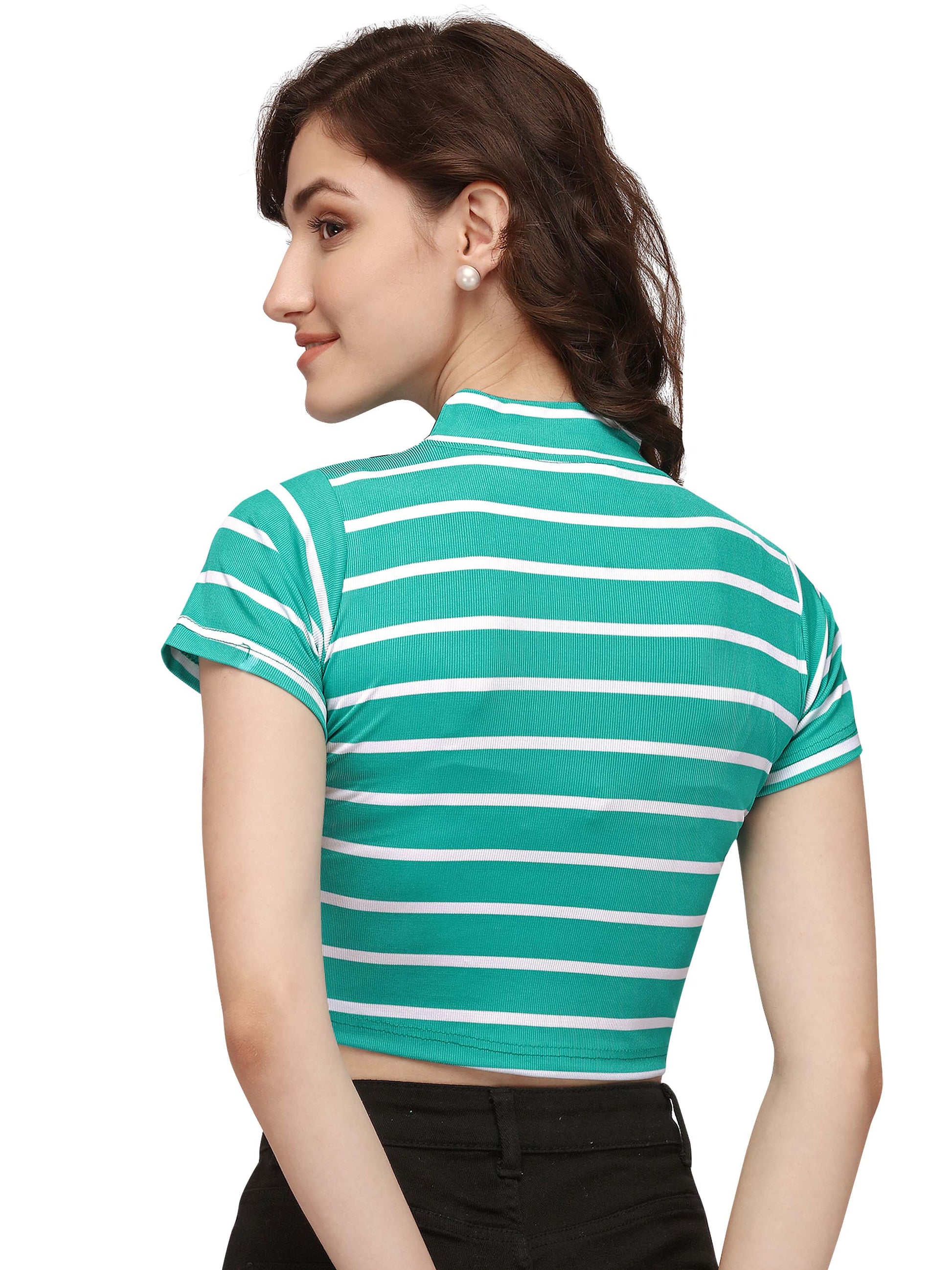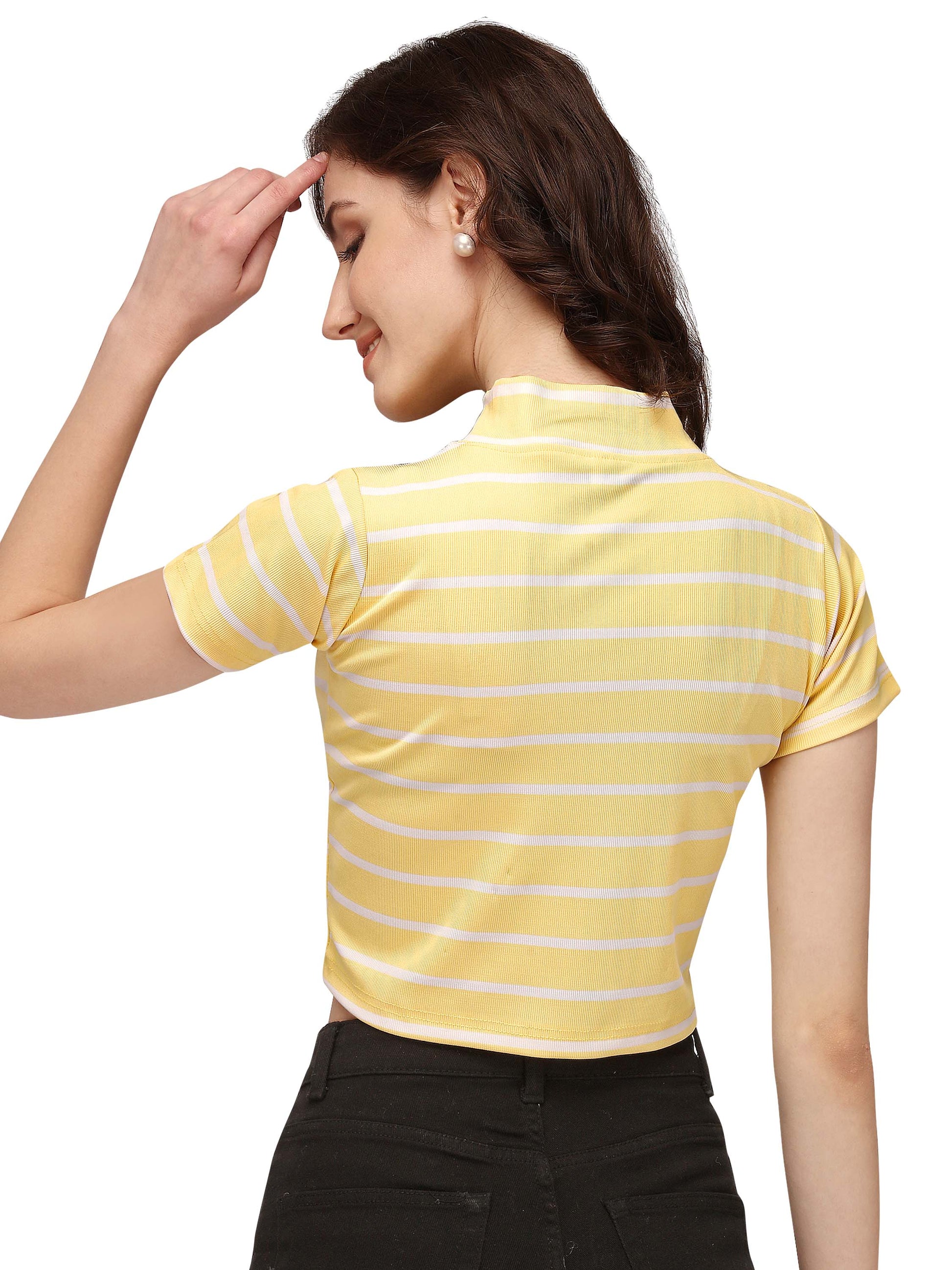 Introducing the NiloBerry Turtle neck striped western crop top, made with soft, breathable 4-way stretchable lycra fabric. With its chic striped pattern, this top pairs perfectly with high waist pants, jeans, or skirts. Never worry about a fashion faux pas again. Order 2 sizes larger than your bra size for the perfect fit. Upgrade your wardrobe today!